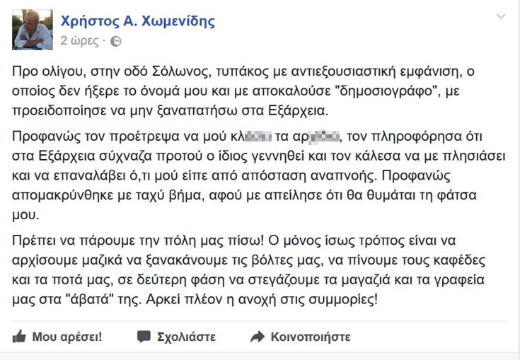 Ο «τυπάκος με αντιεξουσιαστική εμφάνιση», όπως αναφέρει, τον προειδοποίησε να μην ξαναπατήσει στα Εξάρχεια, με τον συγγραφέα να τον προτρέπει «να μού κλ… τα αρ…».