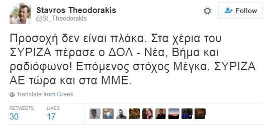 «Προσοχή δεν είναι πλάκα. Στα χέρια του ΣΥΡΙΖΑ πέρασε ο ΔΟΛ – Νέα, Βήμα και ραδιόφωνο! Επόμενος στόχος Μέγκα. ΣΥΡΙΖΑ ΑΕ τώρα και στα ΜΜΕ».