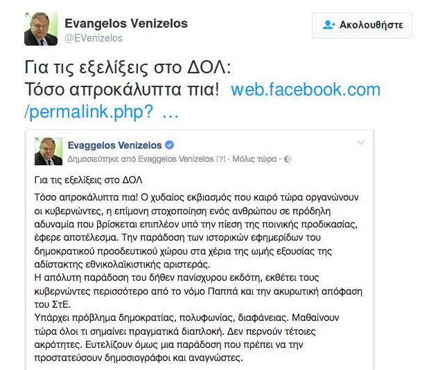Ο κ. Βενιζέλος επισημαίνει επίσης ότι «η απόλυτη παράδοση του δήθεν πανίσχυρου εκδότη, εκθέτει τους κυβερνώντες περισσότερο από το νόμο Παππά και την ακυρωτική απόφαση του ΣτΕ» και καταλήγει: «Υπάρχει πρόβλημα δημοκρατίας, πολυφωνίας, διαφάνειας. Μαθαίνουν τώρα όλοι τι σημαίνει πραγματικά διαπλοκή. Δεν περνούν τέτοιες ακρότητες. Ευτελίζουν όμως μια παράδοση που πρέπει να την προστατεύσουν δημοσιογράφοι και αναγνώστες», αναφέρει σε ανάρτησή του στα social media