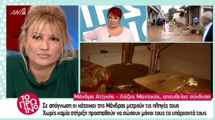 Σύμφωνα με ρεπορτάζ που έκανε ο Κώστας Τσουρός, οι κάτοικοι της Μάνδρας είναι απεγνωσμένοι, καθώς οι ζημιές είναι τεράστιες. Σπίτια, αυτοκίνητα και επιχειρήσεις διαλύθηκαν σε διάστημα ωρών. Η παρουσιάστρια του Πρω1νού άρπαξε την ευκαιρία και αποκάλυψε πως χθες, τηλεφώνησε στην Σάσα Σταμάτη, η οποία μένει στη Μάνδρα Αττικής.