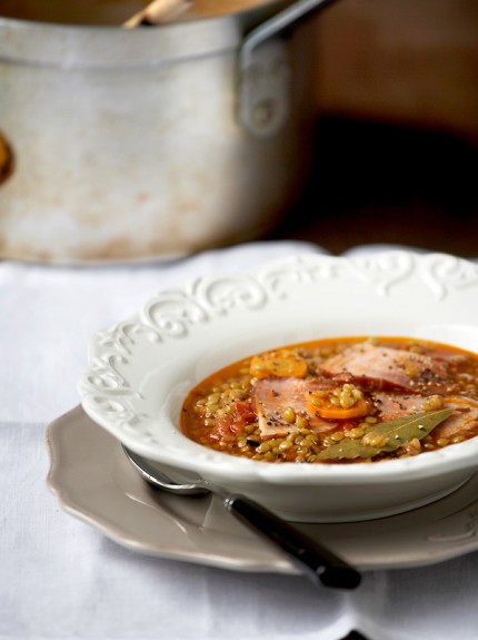 Βράζετε για 20 λεπτά, προσθέτετε το κρασί και συνεχίζετε για άλλα 10 λεπτά ή μέχρι οι φακές να χυλώσουν. Τέλος, προσθέτετε όσο αλάτι θέλετε, ανακατεύετε και σερβίρετε γαρνίροντας με λεπτές φέτες λούτζας.