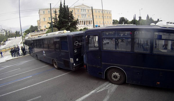 Σήμερα το πρωί, γύρω από το Σύνταγμα θα στηθούν τέσσερις φραγμοί με κλούβες –στα λουλουδάδικα, στην Ηρώδου Αττικού, στο Ζάππειο και στη Βασιλίσσης Όλγας.