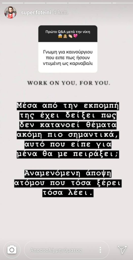 «Μέσα από την εκπομπή της έχει δείξει πως δεν κατανοεί θέματα ακόμη πιο σημαντικά. Αυτό που είπε για μένα θα με πειράξει; Αναμενόμενη άποψη ανθρώπου που τόσα ξέρει τόσα λέει.»