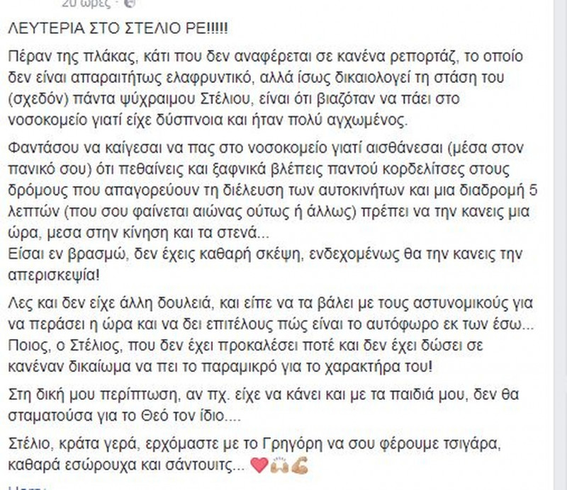 Τη στήριξή του στο πρόσωπο του Στέλιου Διονυσίου έδειξε μέσα από ανάρτηση που έκανε στον προσωπικό του λογαριασμό στο Facebook ο Χάρης Βαρθακούρης, μετά τη σύλληψη του τραγουδιστή, μιας και κατηγορείται ότι χτύπησε τροχονόμο.