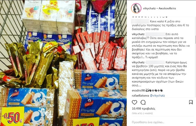 Καλύτερα όμως να βρεθούν 100 μιμητές και ένας που θα κατηγορήσει (εσύ), παρά να μην βρεθεί κανένας μιμητής με το να αποφύγω την ανάρτηση και τον κίνδυνο των κακοπροαίρετων σχολίων (των δικών σου)…», απάντησε η Βίκυ Χατζηβασιλείου.