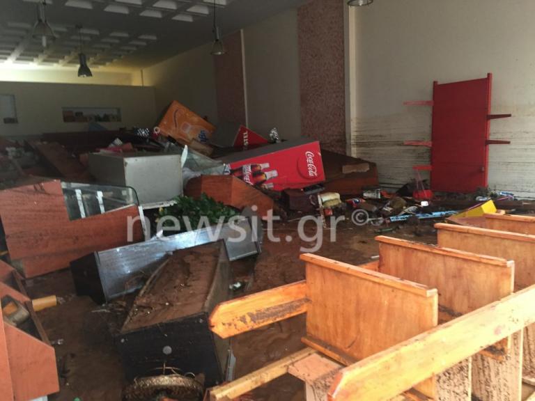 «Μου γκρέμισε τη μάντρα. Το υπόγειο έχει πλημμυρίσει» λέει με απόγνωση στο ΑΠΕ-ΜΠΕ η κ. Ευτέρπη, που προσπαθούσε να βγάλει το νερό και τη λάσπη από την αυλή της. Λίγο πιο κάτω, ο κ. Ιορδάνης, ιδιοκτήτης ψιλικατζίδικου, θα πει ότι «η ζημιά στο μαγαζί είναι γύρω στα 20.000-25.000 ευρώ. Όλα τα έπιπλα που ήταν ξύλινα έχουν καταστραφεί. Τα ψυγεία κάηκαν».