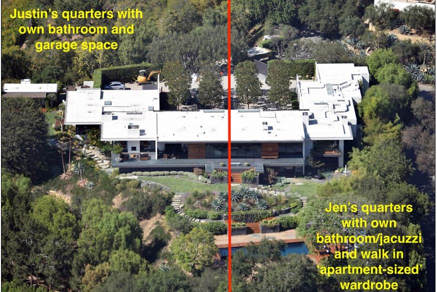 Κατά το δημοσίευμα, η τεράστια πολυτελής έπαυλη στο Bel Air, που ανακαινίστηκε το 2015, αμέσως μετά τον γάμο του ζευγαριού, έχει χωριστεί στα δύο, μέχρι να ληφθούν οι οριστικές αποφάσεις του διαζυγίου. Συγκεκριμένα, η Jennifer κράτησε την δυτική πτέρυγα, όπου βρίσκεται και η γκαρνταρόμπα, ενώ ο Justin την ανατολική, όπου υπάρχει το γκαράζ για τα τουλάχιστον τέσσερα αυτοκίνητα κι άλλες τόσες μηχανές που διαθέτει!