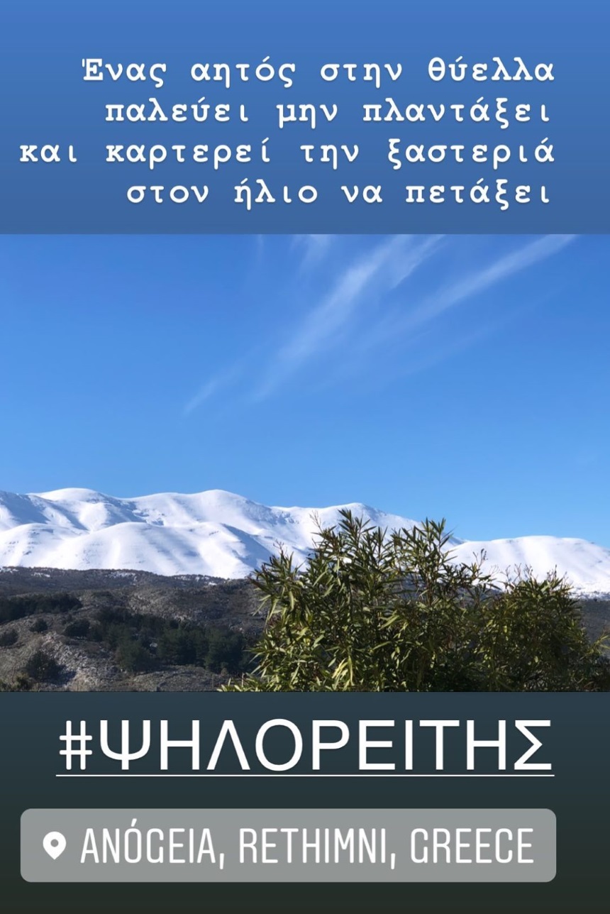 Το ίδιο μήνυμα συνόδευε και το στόρι της, που απεικονίζει τον χιονισμένο Ψηλορείτη και έχει τραβηχτεί από τα Ανώγεια, στο Ρέθυμνο, όπου βρίσκεται η πρώην Υπουργός.