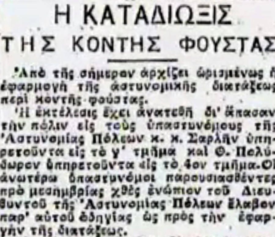 «Κατόπιν διαταγής του Προέδρου της Κυβερνήσεως, καταρτίζεται και υποβάλλεται εις το Υπουργείον Εσωτερικών προς έγκρισιν αστυνομική διάταξις, δι’ ης απαγορεύονται αι κονταί φούσται των γυναικών. Το κατώτατον άκρον της φούστας δέον να απέχη από του εδάφους 30 εκατοστά του μέτρου. Εις τον περιορισμόν τούτον υπάγονται άπασαι αι γυναίκες από του 12ου έτους και άνω. Αι παραβάτιδες θα παραπέμπωνται εις το επ’ αυτοφώρω πταισματοδικείον, συνυπεύθυνοι θα είναι και οι γονείς αυτών. Η εφαρμογή θα αρχίση από 15 Δεκεμβρίου».