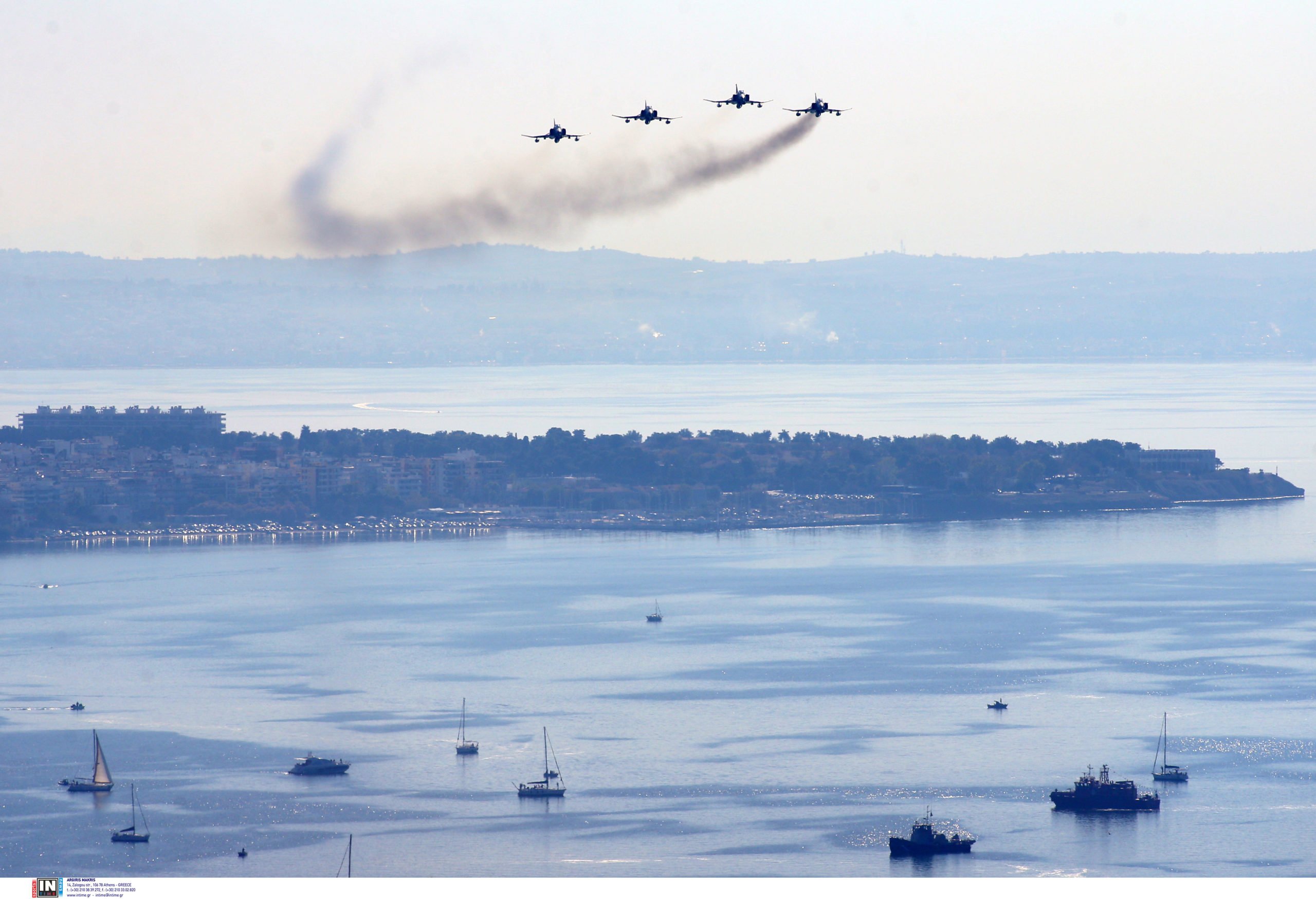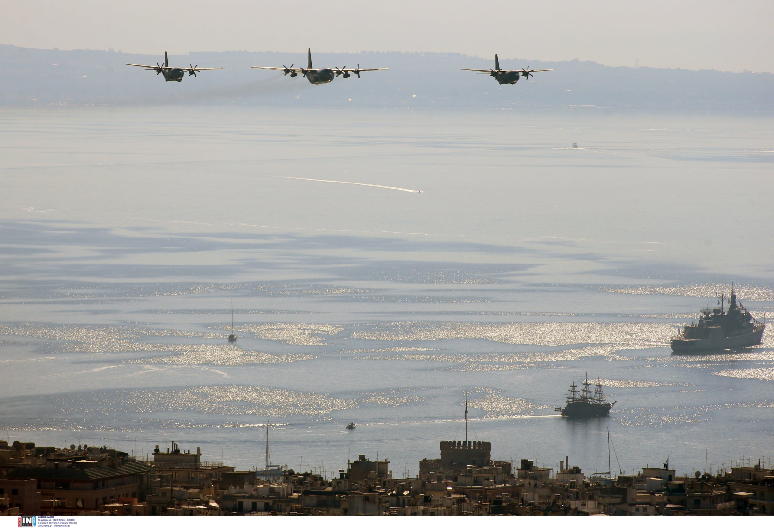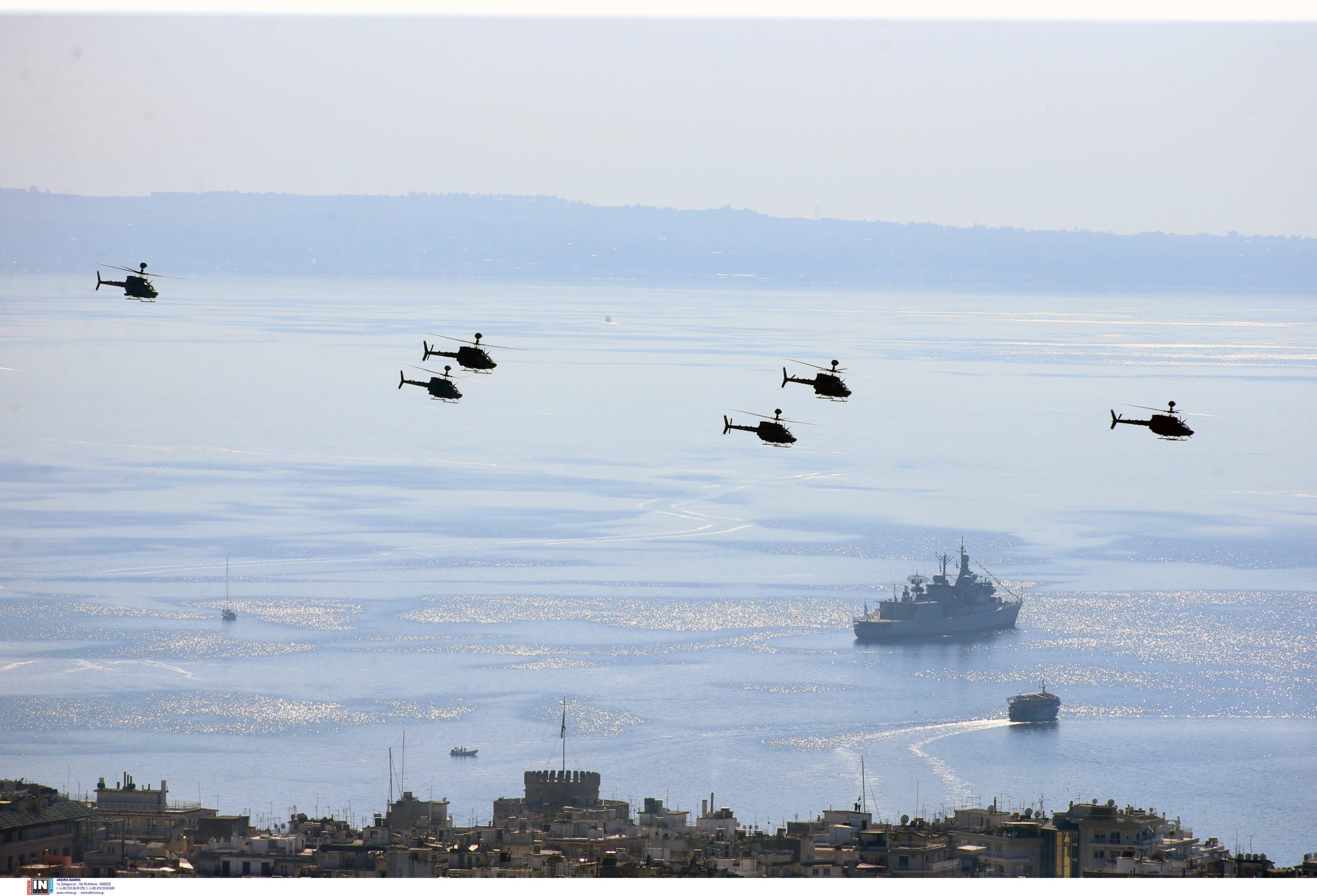 Εντυπωσιακοί ήταν και οι σχηματισμοί μαχητικών αεροσκαφών και ελικοπτέρων που πέταξαν πάνω από τη νέα παραλία της Θεσσαλονίκης.