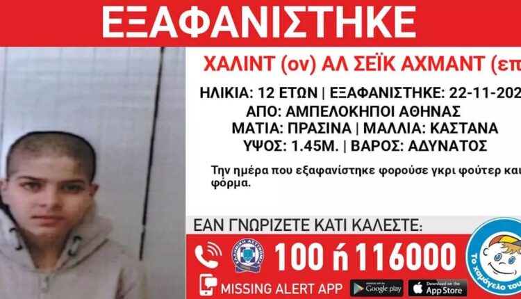 Για την εξαφάνιση του 12χρονου Χαλίντ Αλ Σεϊχ Άχμαντ, το «Χαμόγελο του Παιδιού» ανακοίνωσε ότι τα ίχνη του ανήλικου χάθηκαν στις 3:30 το μεσημέρι της Παρασκευής (22/11) από χώρο φιλοξενίας ασυνόδευτων παιδιών στην περιοχή των Αμπελοκήπων στην Αθήνα, με καταγωγή από την Συρία.
