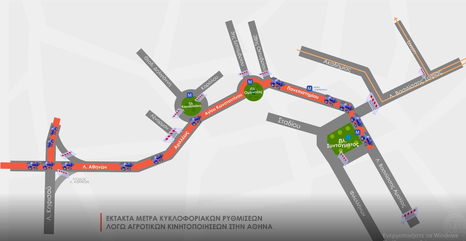 Θα κινηθούν αντίθετα στην οδό Αγ. Κωνσταντίνου, στην πλατεία Ομονοίας και στην οδό Πανεπιστημίου, προκειμένου να φθάσουν στο Σύνταγμα. Θα υπάρξει και προσωρινή διακοπή της κυκλοφορίας πέριξ της πλατείας Ομονοίας.