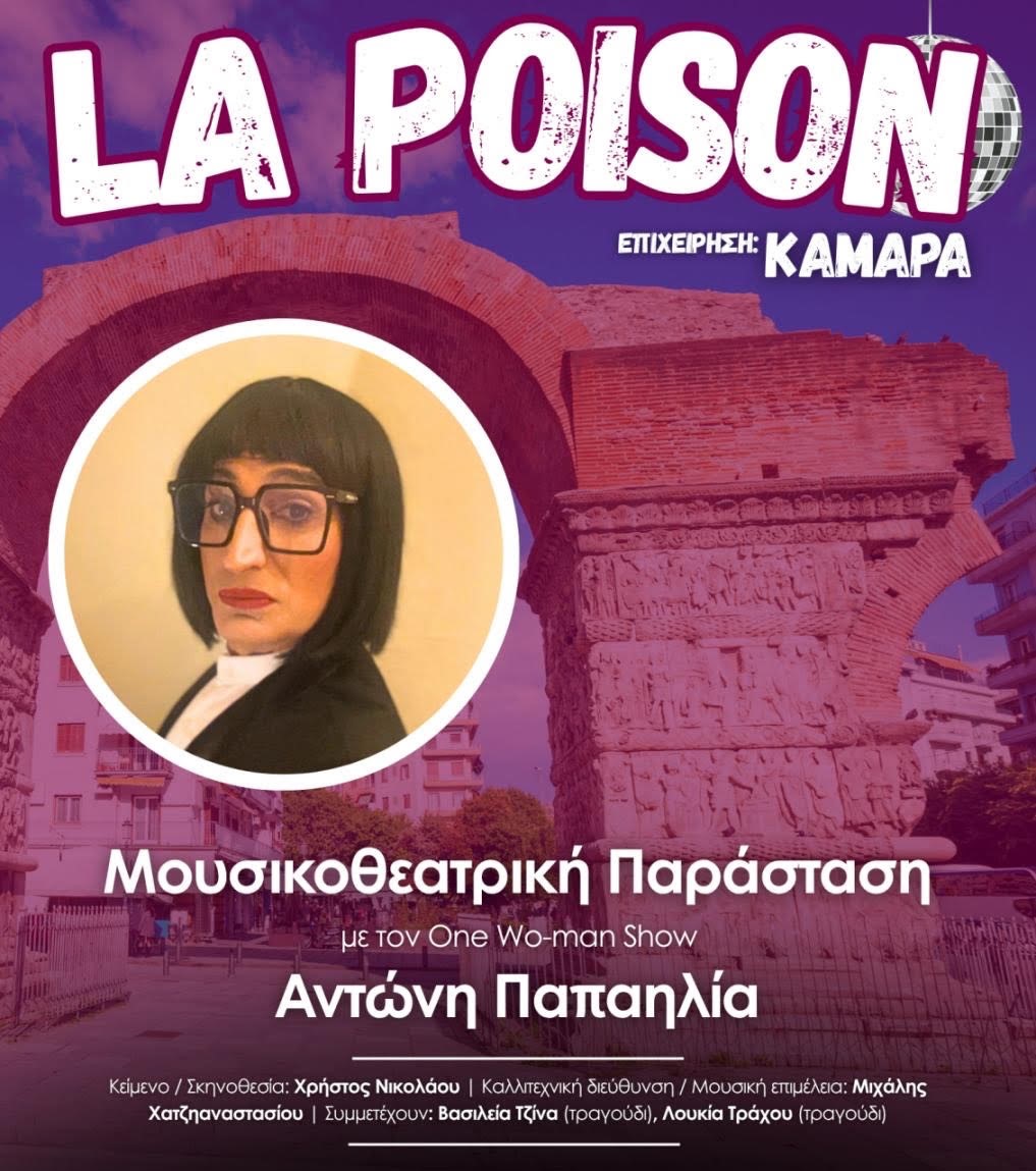 Η “La poison” που θα υποδυθεί ο Αντώνης Παπαηλίας είναι μια διεθνής σουρεάλ μυστική πράκτωρ – κάτι μεταξύ Μάτα Χάρι, … my name ιs Bond και Pink Panther – η οποία, για λόγους ευνόητους που δεν μπορούν να αποκαλυφθούν εκτός παράστασης, ξεμένει στην χώρα μας και συγκεκριμένα στην συμπρωτεύουσα.