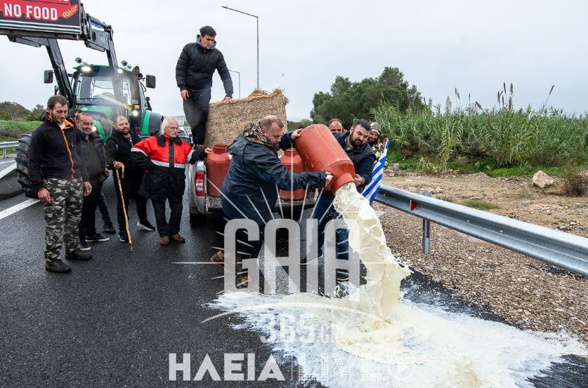 Στην Ηλεία, οι αγρότες έβαλαν φωτιά σε μπάλες με σανό, ενώ κτηνοτρόφοι έριξαν γάλα στην άσφαλτο διαμαρτυρόμενοι για τις χαμηλές τιμές των προϊόντων τους.