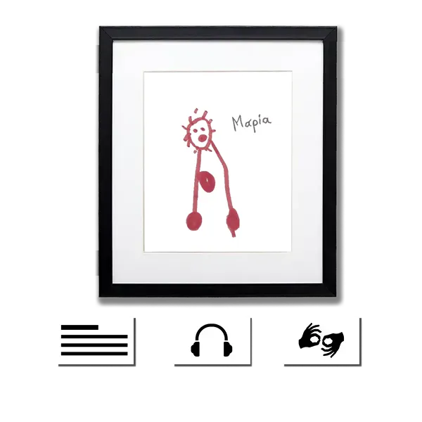 Αυτή είναι η ζωγραφιά ενός κοριτσιού έξι ετών. Σχεδίασε τη μητέρα του, η οποία έχει νοητική αναπηρία. Αυτό έχει δημιουργήσει δύσκολες καταστάσεις για το κορίτσι. Στο σχολείο, οι συμμαθητές και οι συμμαθήτριές του συχνά το κοροϊδεύουν, όταν έρχεται η μητέρα του να το πάρει. Το ίδιο νιώθει ντροπή και απογοήτευση. Στη ζωγραφιά, η έμφαση στο κεφάλι μπορεί να δείχνει τις εσωτερικές συγκρούσεις που βιώνει και την ανάγκη του να κατανοήσει και να αποδεχτεί τη μητέρα του όπως είναι, παρά τα πειράγματα που δέχεται από τους συνομηλίκους και τις συνομήλικές του. Το παιδί δεν είναι σε θέση να εξηγήσει λεκτικά τί του συμβαίνει. Όμως, το σχέδιό του υποδηλώνει την ανάγκη του για κατανόηση των συναισθηματικών του αναγκών και αντιμετώπιση των δυσκολιών της καθημερινότητας.