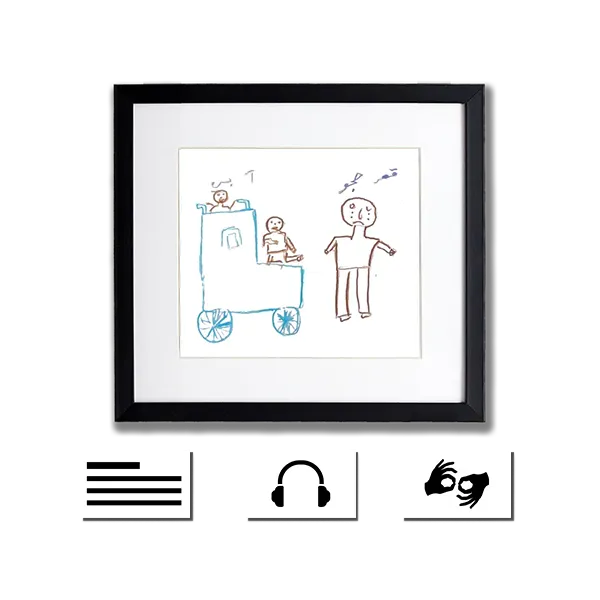 Αυτή είναι η ζωγραφιά του Jamal, δώδεκα ετών, από τη Συρία. Είναι αυτός που κλαίει στα δεξιά. Δίπλα, ο πατέρας του είναι καθισμένος στο αναπηρικό αμαξίδιο, το οποίο σπρώχνει η μητέρα του. Παρουσιάζοντας τη ζωγραφιά του, ο Jamal είπε: «Στενοχωριέμαι να βλέπω τον πατέρα μου σιωπηλό και θλιμμένο. Μου λείπει να του μιλάω. Θέλω να του πω πως η ζωή δεν τελειώνει, επειδή δεν μπορείς να κουνήσεις τα πόδια και τα χέρια σου. Δεν ξέρω αν θα με ακούσει.». Ο πατέρας υπέστη εγκεφαλικό επεισόδιο μετά την εξαφάνιση των δύο αδελφών του κατά τη διάρκεια του πολέμου…