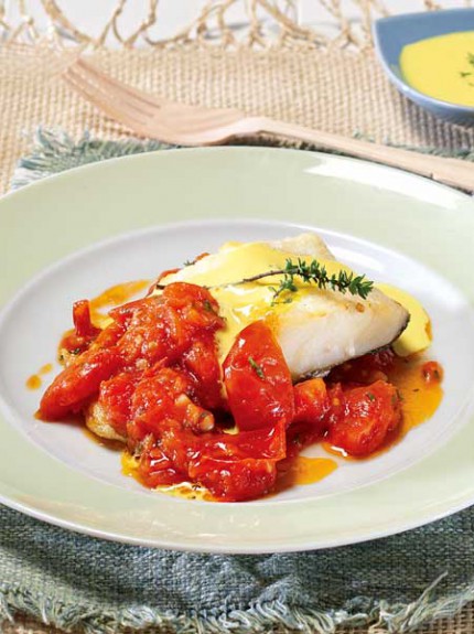 Μπακαλιάρος ψητός με ντοματίνια σοτέ και σάλτσα από κατίκι