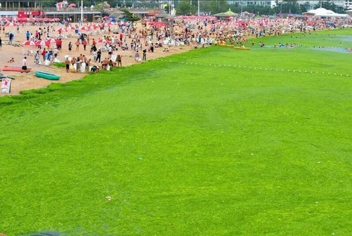 Οι Κινέζοι συνεχίζουν να κολυμπούν στη No 1 παραλία της ανατολικής Κίνας στην πόλη Qingdao όπου τα νερά γέμισαν με το φύκι (enteromorpha prolifera), το οποίο αναπαράγεται με γοργούς ρυθμούς.