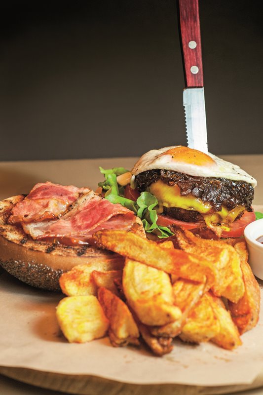 Αναμειγνύουμε όλα τα υλικά της συνταγής, πλάθουμε σε μπιφτέκια & αφήνουμε στο ψυγείο για τουλάχιστον μία ώρα. Ψήνουμε σε αντικολλητικό τηγάνι ή σχαροτήγανο, με ελάχιστο ελαιόλαδο, σε δυνατή φωτιά για περίπου 5 λεπτά από την κάθε μεριά. Στη συνέχεια ψήνουμε τα ψωμάκια από κάθε μεριά, προσθέτουμε κέτσαπ, λόλα, τομάτα,το μπιφτέκι, τυρί τσένταρ, καραμελωμένο κρεμμύδι, μπέικον και από επάνω ένα τηγανιτό αυγό.