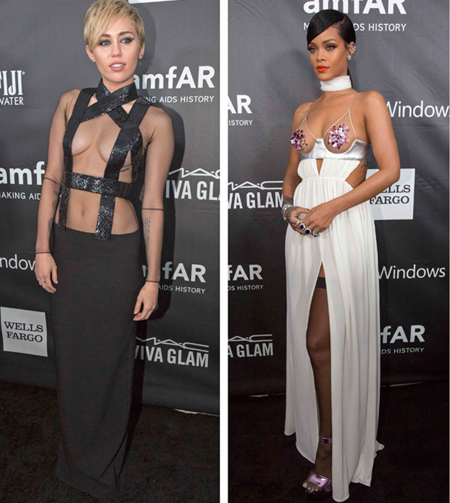 Η 26χρονη καλλονή Ριάνα (Rihanna) και η 21 ετών τραγουδίστρια του «The Wrecking Ball», Μάιλι Σάιρους (Miley Cyrus) περπάτησαν στο κόκκινο χαλί της εκδήλωσης AmFar Gala ντυμένες, που λέει ο λόγος!