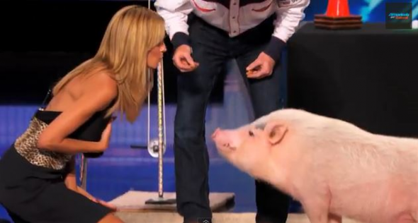 Η ξανθιά καλλονή, μέλος της κριτικής επιτροπής, πλησίασε το γουρούνι -που ονομάζεται Mudslinger- με δόλωμα ένα μπισκότο στο στόμα και προσπάθησε να το φιλήσει. ‘Όμως, φαίνεται ότι δεν σαγήνευσε αμέσως το συμπαθές τετράποδο που δεν ανταποκρινόταν στο…κάλεσμα. Τελικά τα κατάφερε, το φιλί δόθηκε και το κοινό ξέσπασε σε χειροκροτήματα.