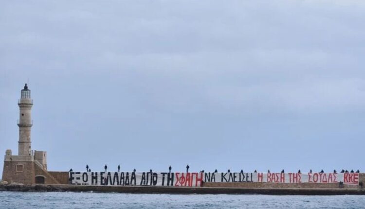 Ένα γιγαντιαίο πανό ανήρτησε το ΚΚΕ στο Παλιό Λιμάνι των Χανίων, για τον πόλεμο στο Ιράν, με το μήνυμα «Έξω η Ελλάδα από τη σφαγή, να κλείσει η βάση της Σούδας».