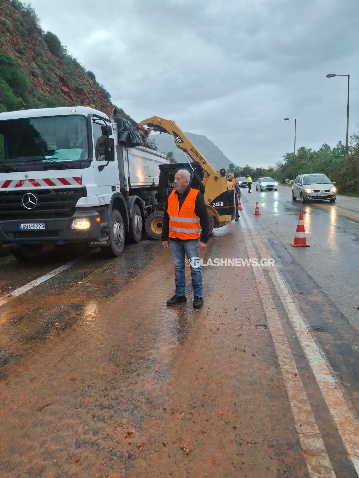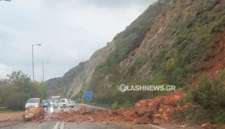 Λόγω της έντονης βροχόπτωσης αποκολλήθηκαν βράχοι, οι οποίοι κατέληξαν στο οδόστρωμα.