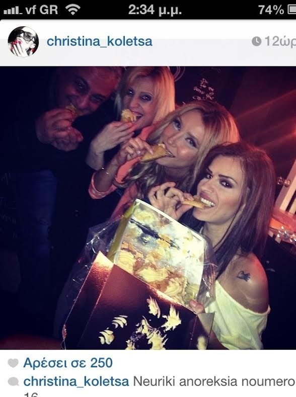 Η γνωστή τραγουδίστρια «ανέβασε» μια φωτογραφία στο instagram και με αυτό τον τρόπο «έκλεισε» τα στόματα σε όσους διέδιδαν αυτές τις φήμες. Στη φωτογραφία απεικονίζεται η τραγουδίστρια με την παρέα της να τρώνε γλυκά τρίγωνα… ενώ σχολίασε: «Νευρική ανορεξία Νο 16».