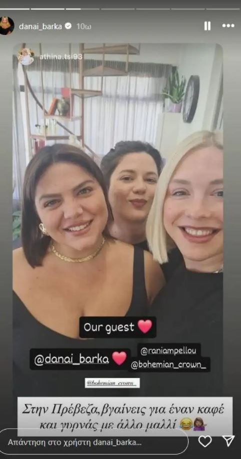 «Στην Πρέβεζα βγαίνεις για έναν καφέ και γυρνάς με άλλο μαλλί», έγραψε ως λεζάντα στην ανάρτησή της η Δανάη Μπάρκα.