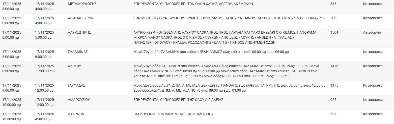 ΔΕΔΔΗΕ: Διακοπές ρεύματος σήμερα (17/11) σε 12 περιοχές της Αττικής