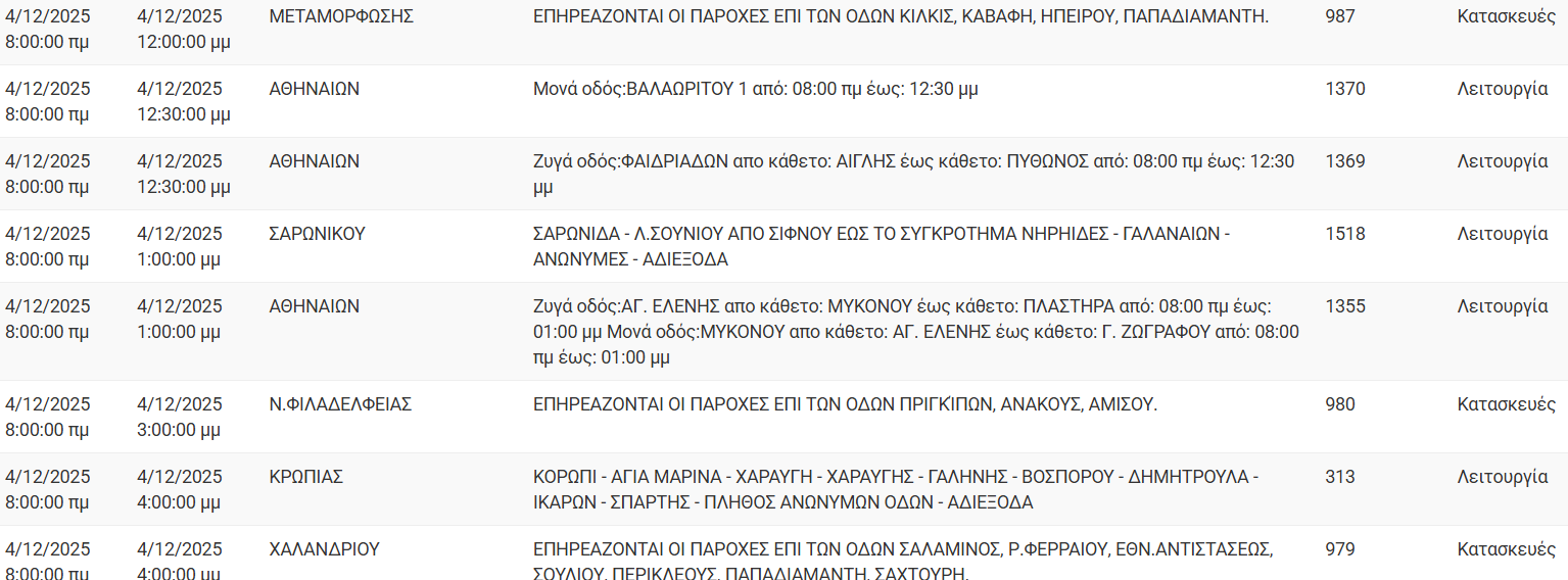 ΔΕΔΔΗΕ: Διακοπές ρεύματος σήμερα (4/12) στην Αθήνα και σε άλλες 17 περιοχές της Αττικής