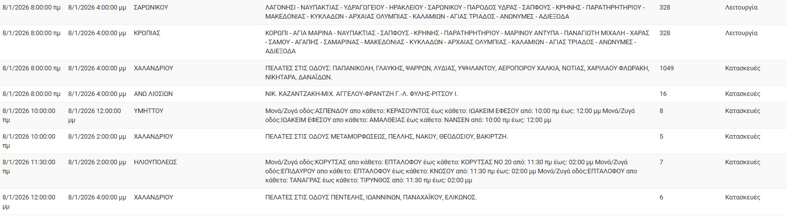 ΔΕΔΔΗΕ: Διακοπές ρεύματος σήμερα (8/1) στην Αθήνα και σε άλλες 10 περιοχές της Αττικής
