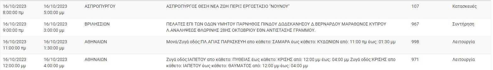 Διακοπές ρεύματος έχει προγραμματίσει για σήμερα, Δευτέρα 16 Οκτωβρίου, ο ΔΕΔΔΗΕ σε διάφορες περιοχές της Αττικής.