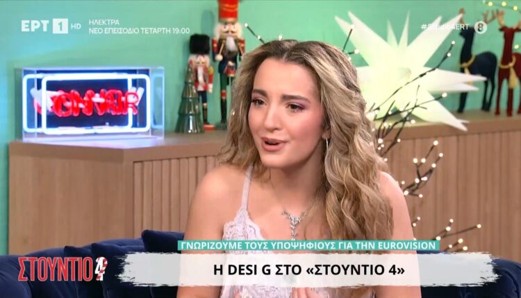 Στην εκπομπή «Στούντιο 4» της ΕΡΤ εμφανίστηκε το απόγευμα της Δευτέρας 5 Ιανουαρίου η Desi G, λίγες ώρες μετά την ανακοίνωση της πρόκρισής της στον εθνικό τελικό της Eurovision, όπου συγκαταλέγεται πλέον στους 28 φιναλίστ. Η νεαρή τραγουδίστρια, εμφανώς συγκινημένη, περιέγραψε τη στιγμή που έμαθε ότι προχωρά στην επόμενη φάση, μίλησε με ενθουσιασμό για το τραγούδι της «Aphrodite», ενώ αποκάλυψε και πτυχές από τη βαθιά της σύνδεση με την Ελλάδα.