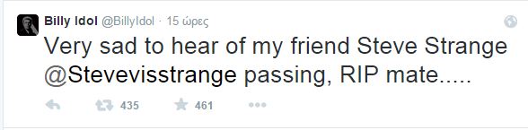 Ο τραγουδιστής Billy Idol έγραψε στο twitter: “Ειμαι πολυ λυπημένος. Εμαθα ότι πέθανε ο φίλος μου ο Steve Strange”.