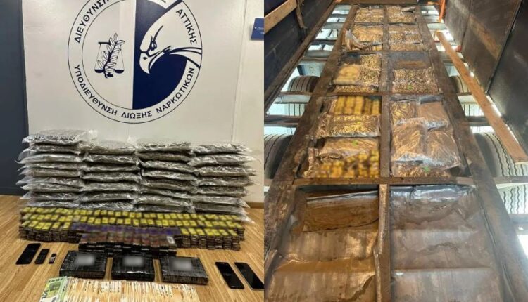 Σε συντονισμένη αστυνομική επιχείρηση που πραγματοποιήθηκε μεσημβρινές ώρες χθες (22/10), σε περιοχή της Ανατολικής Αττικής, από αστυνομικούς του Τμήματος Γενικών Υποθέσεων της Υποδιεύθυνσης Δίωξης Ναρκωτικών, οι 2 κατηγορούμενοι κατελήφθησαν να έχουν στην κατοχή τους, εντός ειδικής διαμορφωμένης κρύπτης στο δάπεδο ρυμουλκούμενου επικαθήμενου, περισσότερα από 77 κιλά κάνναβης και 3 κιλά κοκαΐνης, μοιρασμένα σε αυτοσχέδιες νάιλον συσκευασίες.
