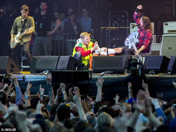 Ο τραγουδιστής του μουσικού συγκροτήματος Foo Fighters και πρώην ντράμερ των Nirvana, Ντέιβ Γκρολ, έπεσε χθες από τη σκηνή στη διάρκεια συναυλίας στο στάδιο Ullevi του Γκέτενμποργκ της Σουηδίας, μπροστά στα μάτια χιλιάδων ανθρώπων, κι έσπασε το πόδι του, όμως με μία μικρή διακοπή για να δεχτεί τις πρώτες βοήθειες, κατάφερε να ολοκληρώσει το πρόγραμμα.