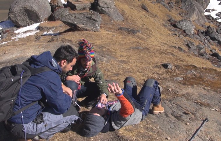 «Βρήκα ένα καταφύγιο που είχε κάποιες κουβέρτες μόνο. Λίγο μετά, ένας γάλλος επαγγελματίας ορειβάτης μας ενημέρωσε πως έπρεπε οπωσδήποτε να κατέβουμε υψόμετρο γιατί κινδύνευα με ανεύρυσμα εγκεφάλου. Ελικόπτερο δεν μπορούσε να ανέβει πάνω, γιατί νύχτωνε. Είχαμε δύο επιλογές: Να με πάρουν σηκωτό στην πλάτη τα παιδιά μέσα στη νύχτα με φακό, ή να μείνουμε το βράδυ στο καταφύγιο» αποκαλύπτει για τις κρίσιμες ώρες.