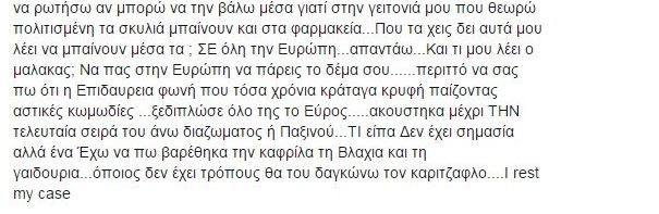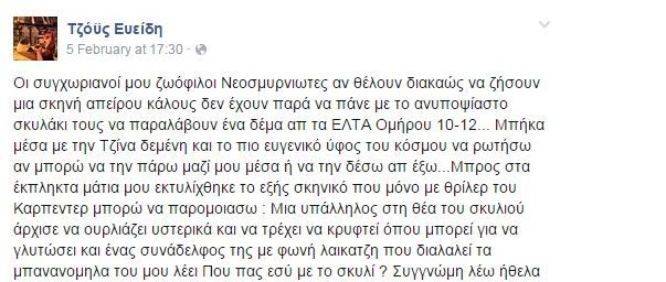 Έξαλλη η Τζόυς Ευείδη 12/02/2015 Share Τί συνέβη και βγήκε εκτός εαυτού η γνωστή ηθοποιός; Ξέσπασε μέσω facebook η ηθοποιόςΤζόυς Ευείδη για το περιστατικό που της συνέβη στα ΕΛΤΑ με το σκυλάκι της. Η ηθοποιός ζήτησε να μπει στα ΕΛΤΑ με το σκυλάκι της και αμέσως οι αντιδράσεις ήταν τόσο έντονες που εκτυλίχθηκε καβγάς. Δείτε τι έγραψε η ηθοποιός: