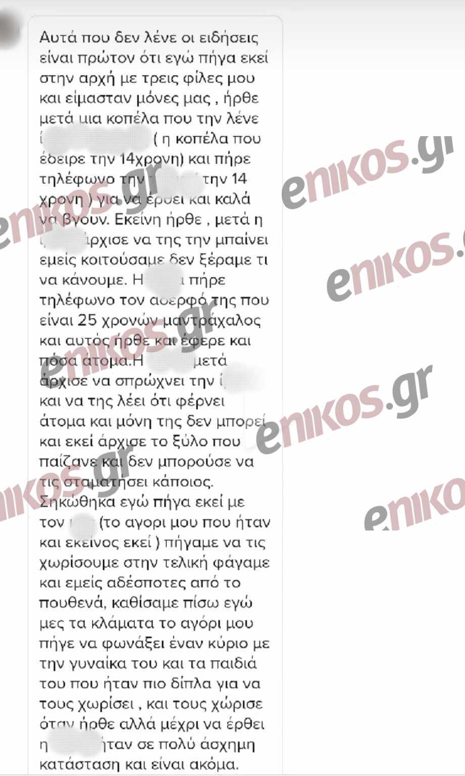 Σε άλλο στιγμιότυπο από τις ομαδικές συνομιλίες που έχουν δημιουργηθεί, αφού είχαν προηγηθεί όλα τα παραπάνω, η Ι. φέρεται να ξεκαθαρίζει την δική της θέση για το περιστατικό του άγριου ξυλοδαρμού της 14χρονης, ενώ παράλληλα, αναφέρει και τα ονόματα των κοριτσιών που συμμετείχαν, δίχως και εκείνη να σκεφτεί στιγμή πως ενδεχομένως, τις εκθέτει σε κίνδυνο.