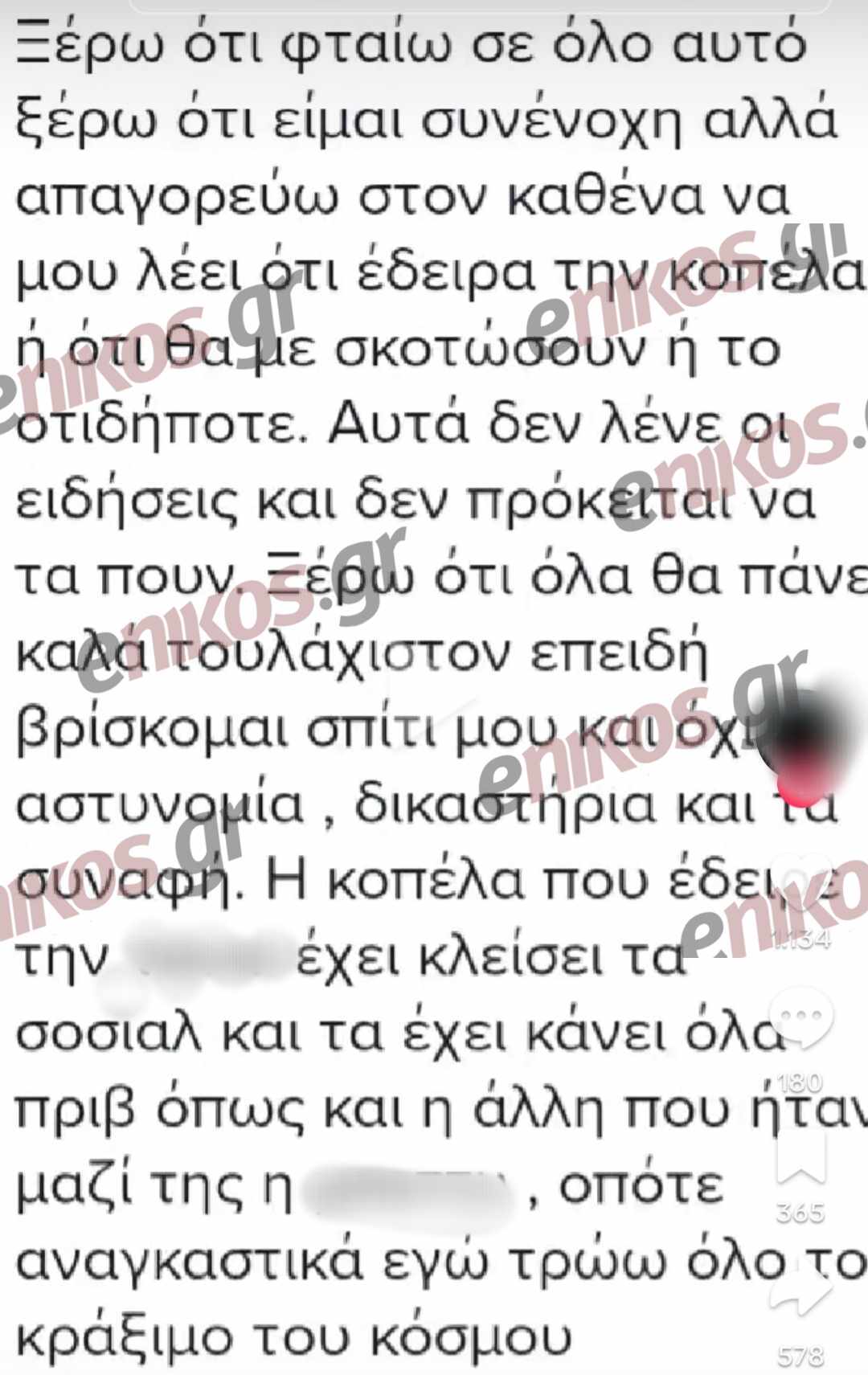 Μεταξύ άλλων, αναφέρει πως γνωρίζει πως είναι συνένοχη, αλλά «απαγορεύω στον καθένα να λέει ότι έδειρα την κοπέλα ή ότι θα με σκοτώσει».