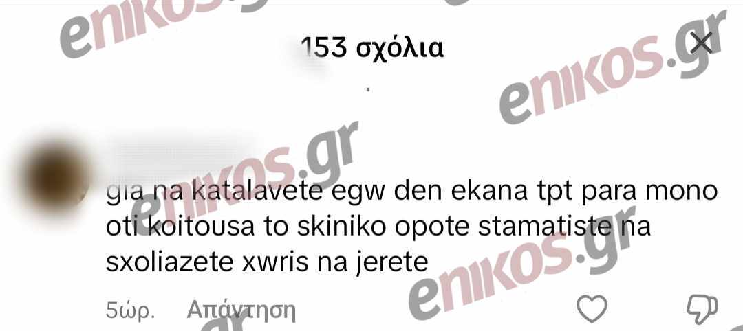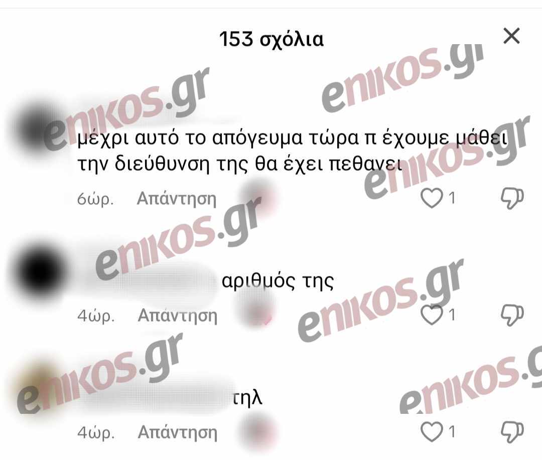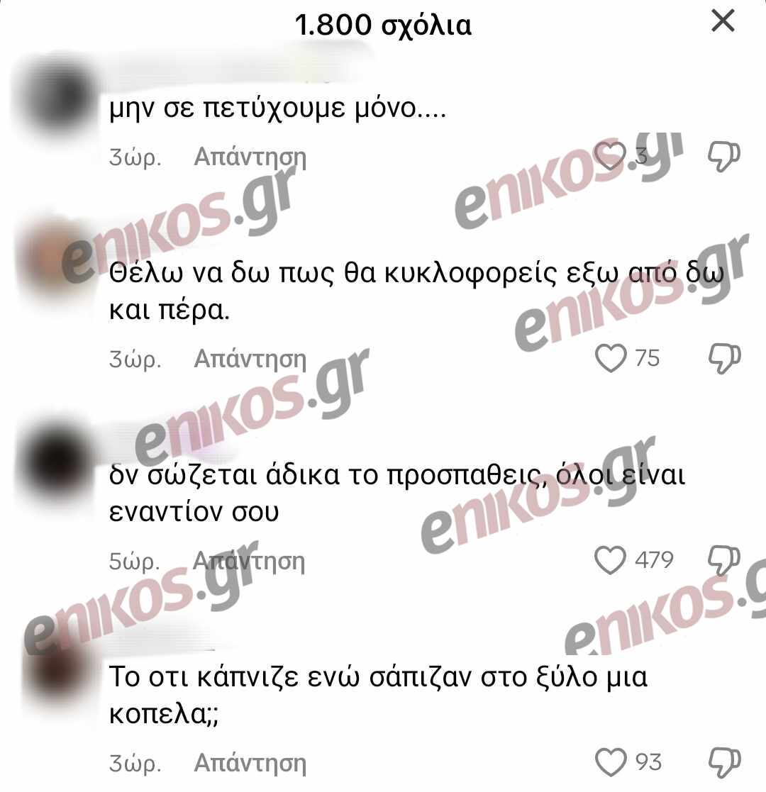 Όπως μπορείτε να δείτε στις φωτογραφίες που δημοσιεύει το enikos.gr από βίντεο που έχουν αναρτηθεί τα τελευταία 24ωρα στο TikTok, δεκάδες ανήλικοι, γράφουν «Ι. (αναφέρεται όνομα ανήλικης) πώς νιώθεις που σε ψάχνει όλη η Ελλάδα;».