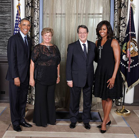 H γυναίκα του Κύπριου προέδρου με διάφανη μπλούζα δίπλα στον Obama