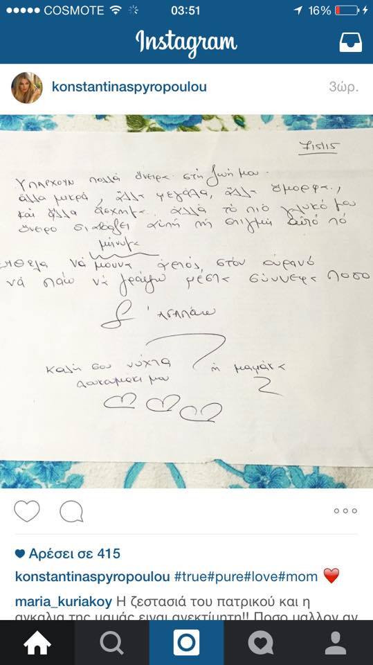 Η παρουσιάστρια που είναι φανατική χρήστης των social media, ανέβασε μία φωτογραφία με ένα χειρόγραφο μήνυμα που, αν και η ίδια δεν το ξεκαθαρίζει, μοιάζει να της το έχει αφήσει η μαμά της, με την οποία είναι γνωστό πως έχουν μια πολύ ζεστή σχέση.