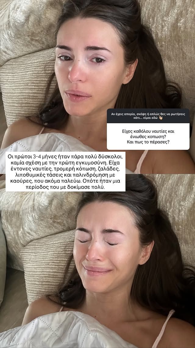 Οι πρώτοι 3-4 μήνες ήταν πάρα πολύ δύσκολοι, καμία σχέση με την πρώτη εγκυμοσύνη. Είχα έντονες ναυτίες, τρομερή κόπωση, ζαλάδες, λιποθυμικές τάσεις και παλινδρόμηση με καούρες που ακόμα παλεύω. Οπότε ήταν μια περίοδος που με δοκίμασε πολύ.