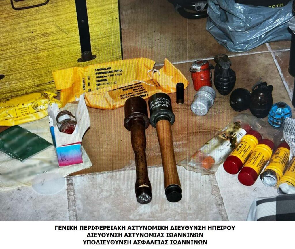 Συγκεκριμένα βρήκαν : 485 φυσίγγια διαφόρων τύπων όπλων και διαμετρημάτων, 3 πιστόλια, διαμετρήματος 9mm, 7,65mm και 6,35mm το καθένα, ραβδωτό πυροβόλο όπλο, τύπου επαναληπτικού τυφεκίου, ραβδωτό πυροβόλο τυφέκιο μονής βολής, περίστροφο χωρητικότητας 7 φυσιγγίων, μη λειτουργικό περίστροφο, εκπαιδευτικός όλμος, γερμανική χειροβομβίδα Β΄ Παγκοσμίου πολέμου, οξειδωμένη ιταλική χειροβομβίδα Β΄ Παγκοσμίου πολέμου, εκπαιδευτική χειροβομβίδα, 4 κενές χειροβομβίδες (άνευ εκρηκτικού και συστήματος πυροδότησης), κορμός και κέλυφος χειροβομβίδας, 39γεμιστήρες, 40 ξιφολόγχες, διάφορα τμήματα (κοντάκια, κάννες κτλ.) πολεμικών τυφεκίων, κάννη υποπολυβόλου, σιγαστήρα πολεμικού όπλου, 20 κροτίδες,16 ναυτικές φωτοβολίδες χειρός, 4 συσκευασίες φωτοβολίδων μαζί με εκτοξευτήρα και 2 εκτοξευτήρες φωτοβολίδων.