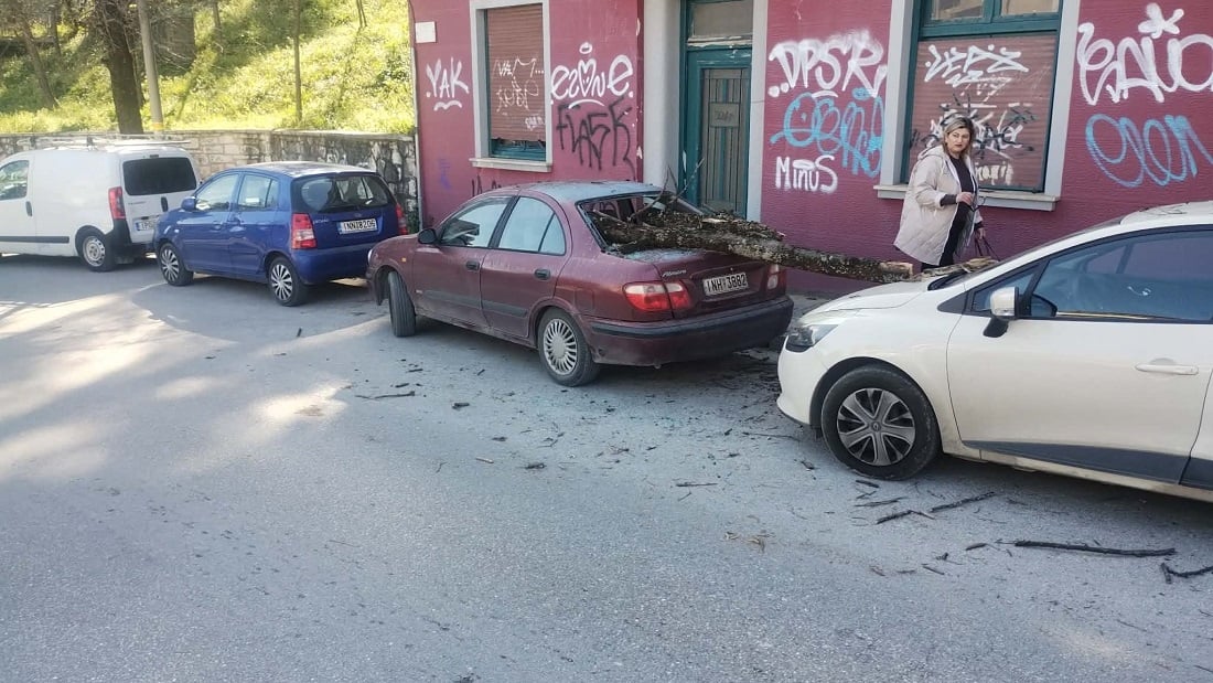 Υλικές ζημιές σε δύο σταθμευμένα αυτοκίνητα επί της οδού Μπιζανίου στα Ιωάννινα, λίγα μέτρα από το Δημοτικό Ωδείο, προκάλεσε η πτώση μεγάλων κλαδιών δέντρων, το μεσημέρι της Τετάρτης (11/3).