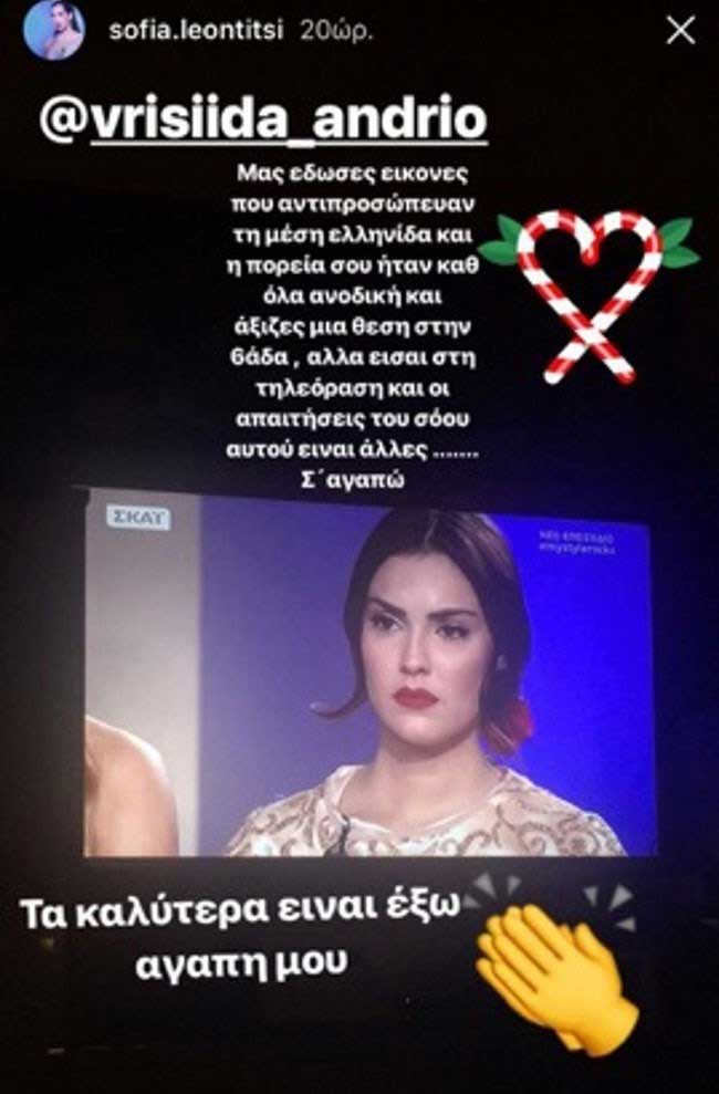 Η πρώην παίκτρια ανέβασε στον προσωπικό της λογαριασμό στο Instagram ένα instastory με τη Βρισηίδα στην τελευταία εμφάνιση της στο σόου σχολιάζοντας: «Μας έδωσες εικόνες που αντιπροσώπευαν τη μέση Ελληνίδα η πορεία σου ήταν καθ’ όλα ανοδική και άξιζες μια θέση στην 6αδα, αλλά είσαι στην τηλεόραση και οι απαιτήσεις του σόου αυτού είναι άλλες… Σ’ αγαπώ. Τα καλύτερα είναι έξω αγάπη μου».