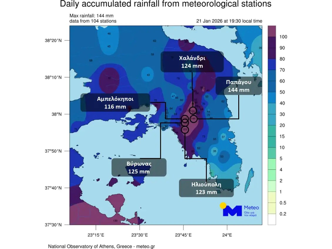 Σύμφωνα με το δίκτυο αυτόματων μετεωρολογικών σταθμών του Εθνικού Αστεροσκοπείου Αθηνών / Meteo.gr, τα μεγαλύτερα ύψη βροχής έως τις 20:00 της Τετάρτης καταγράφηκαν στην περιοχή Παπάγου Αττικής, φτάνοντας τα 146,4 χιλιοστά. Ακολούθησαν η Τακτικούπολη Τριζοινίας με 130,4mm, ο Βύρωνας με 126,4mm, το Χαλάνδρι με 125,8mm, η Ηλιούπολη με 124,4mm και το Νομισματοκοπείο με 123mm.