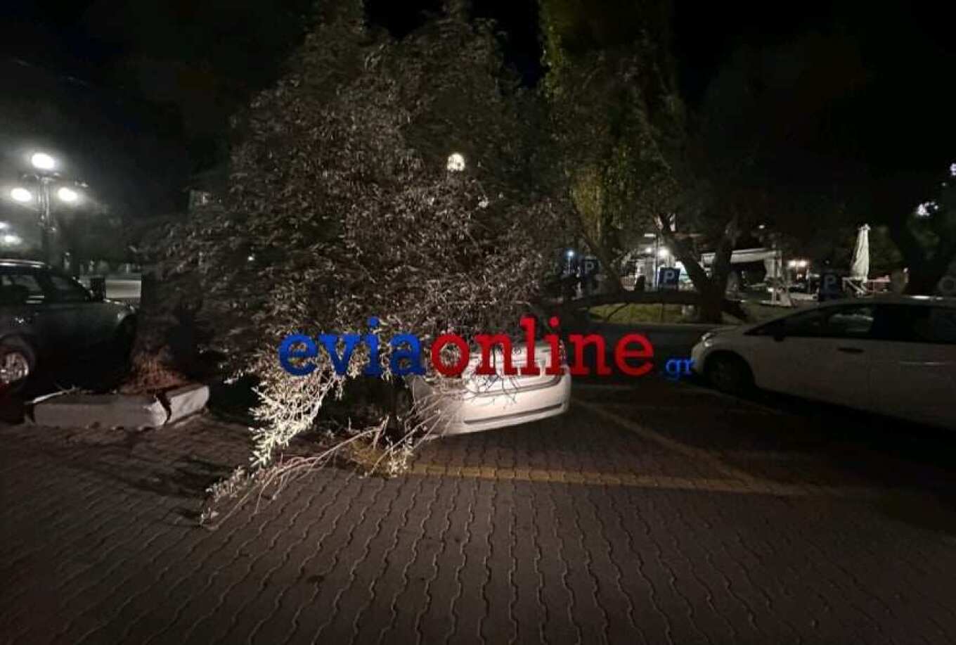 Σύμφωνα με το eviaonline.gr, δέντρα ξεριζώθηκαν στην πλατεία Αγία Νικολάου και έπεσαν πάνω σε σταθμευμένα οχήματα, ενώ την ίδια ώρα αναποδογύρισαν και κάδοι απορριμμάτων με αποτέλεσμα τα σκουπίδια να διασκορπιστούν.